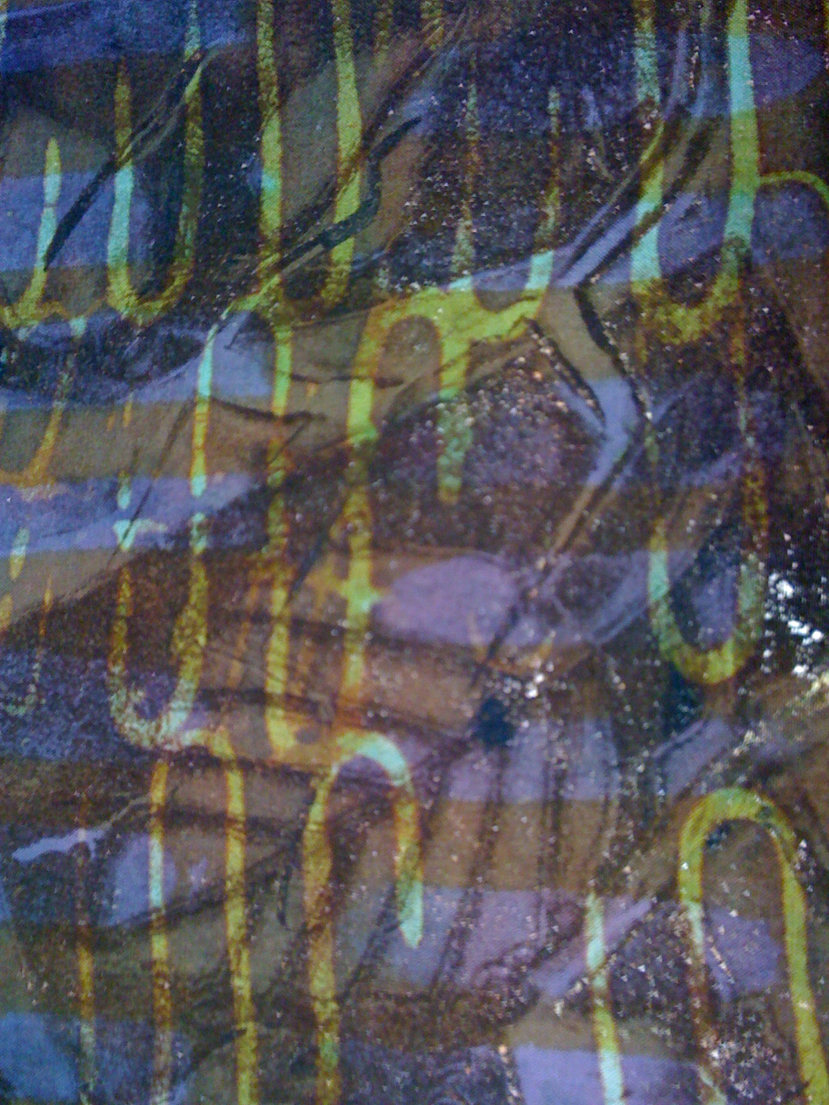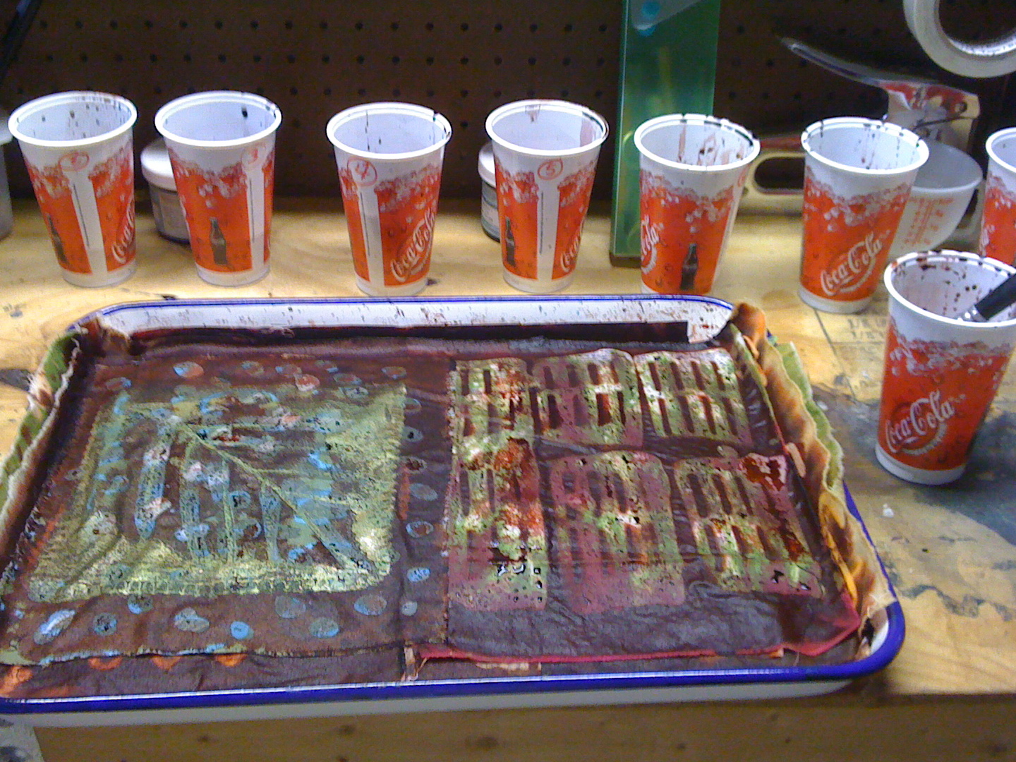 | Here's a couple of fabrics toward the top of the layers after the dye has been applied with a brush. Pretty ugly huh? The final color and result will be much lighter and look completely different from what you see here. |