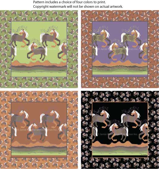 This is an A+ Pattern: Which means it includes original artwork by (me) Jamie Kalvestran licensed to you for use with this pattern. It is to be printed on printable fabric with a color ink jet printer. I suggest you print the artwork first and then take it with you to the fabric shop to choose your coordinating fabric. The colors will vary with printers and printable fabrics. Have fun with it!