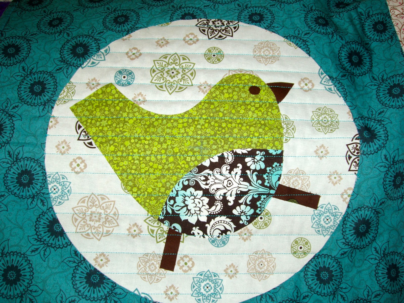 My dad owns a 6 head embroidery machine that we used for the quilting. Him and I set up a circle design with lines going through it to allow all the appliquéd pieces to be stitched down, instead of going around each piece. We had to hoop up and sew each of the nine circles separately because the hoops are only 20 inches square. The top thread is a turquoise and we made our own pink bobbin for the back.